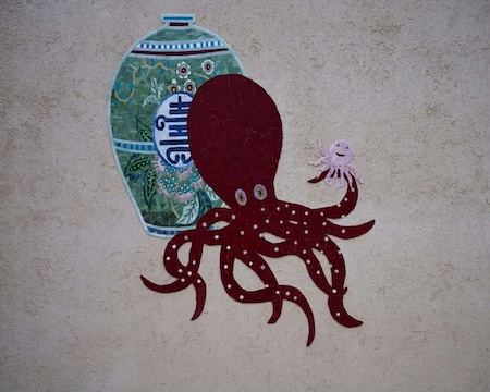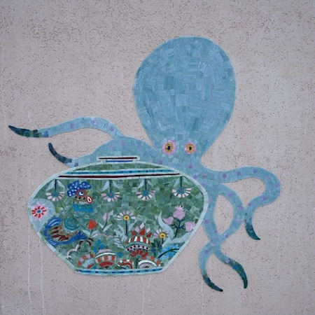 大阪は水がものを運び様々なものが行き交うことで栄えてきました。瑞穂の国、日本では古来の信仰や考え方の根底に、海の向こうから良いものがやってくるという文化があります。大阪といえば蛸、タコの八本足は日本では八は末広といって幸先がいいという意味を表します。また八方良しー全方位に良きことがあるようーまさに訪れる方々、大阪に幸多かれという思いで、タコとその素敵な棲家である大阪を表現しました。大阪港に隣接する場所なのでステンドグラスで水のきらめきを感じる作品を作らせていただきました。会期 : 2025年4月11日-10月13日