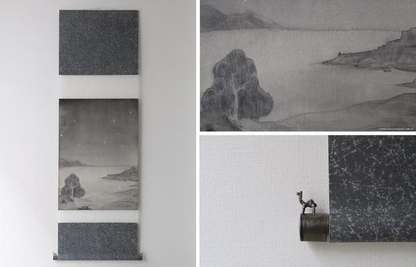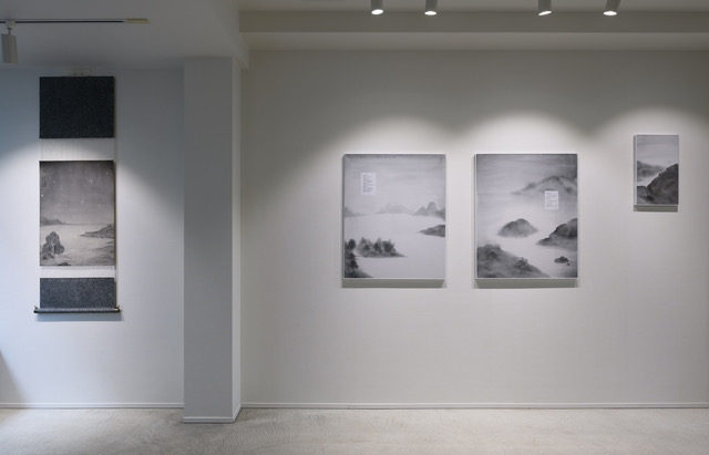 本展タイトルのようにiwao galleryの立地(隅田川沿い)から川縁の町が持ってるどこか留まらない、流れていく時間や感覚をモノクロの墨絵の世界観で表しています。寂寥感のある一瞬の優しさを汲み上げ、ミヤケの得意とする作品と場所の接点、そして土地と自分の接点を探すような作品です。