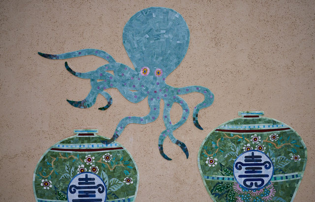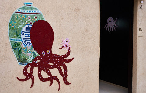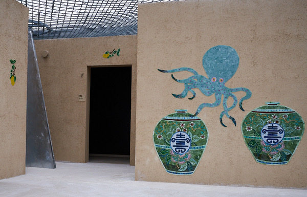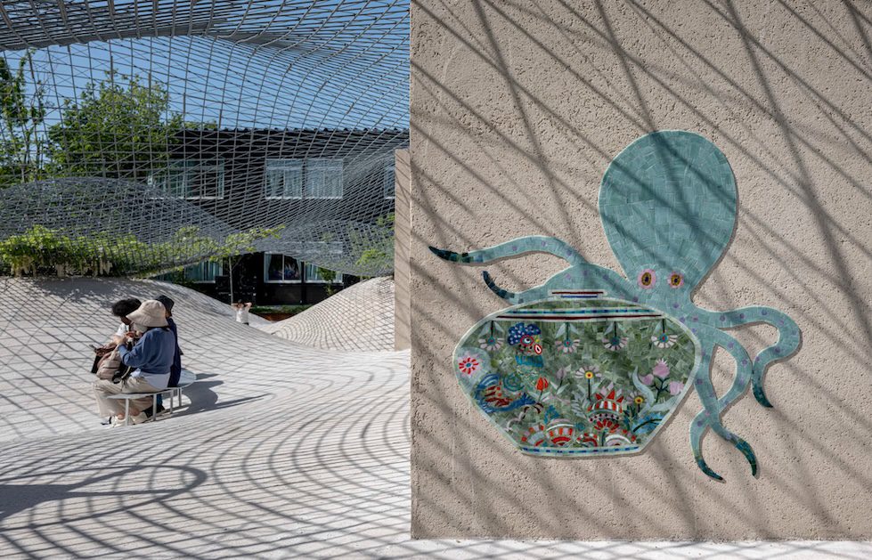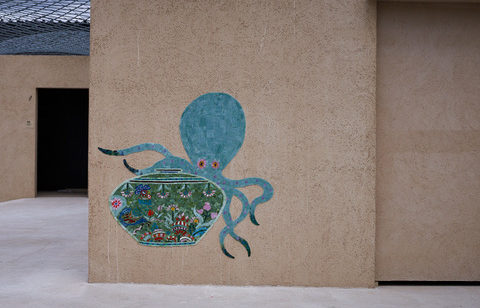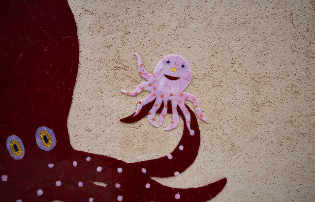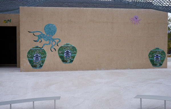 祈祷室や授乳室、クーリンクルームなどもあるエリアなので、裏の授乳室は授乳室が一目で探しやすいように、又中の赤ちゃんが眺めるものがあるように、ここだけ中にもモザイクを作らせて頂きました。